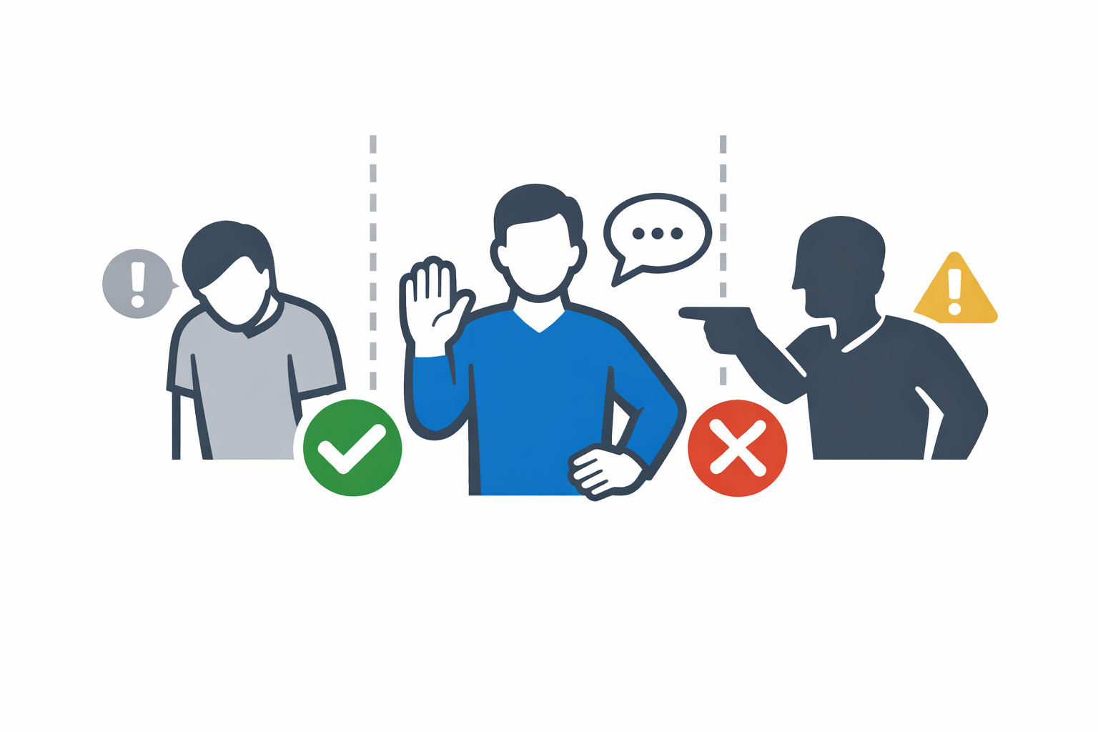 - Brak cech agresji – zachowania asertywne nie polegają na narzucaniu swojego zdania, podnoszeniu głosu czy wywieraniu presji na rozmówcę.