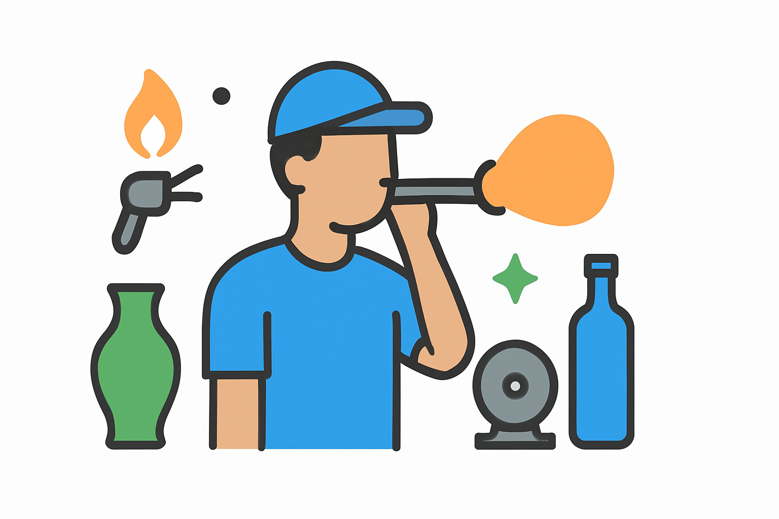 - Formowanie wyrobów szklanych poprzez dmuchanie rozgrzanego szkła przy użyciu specjalnych narzędzi.